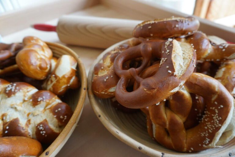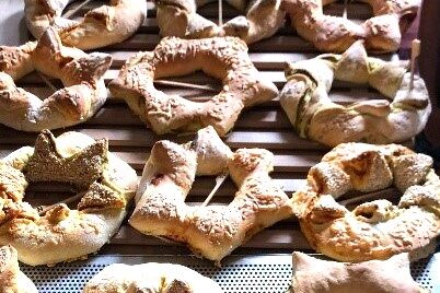Gemeinsam starteten sie mit der Zubereitung von leckeren Pesto-Sternen. Dabei wurde Basilikum- oder Tomatenpesto zwischen zwei Hefeteigfladen gegeben und kreativ verziert, ob mit Sesam, Käse oder auf andere kunstvolle Art. Während die Pestosterne im Ofen gebacken wurden, begannen sie Mutscheln zu formen – nicht ganz saisonal, aber dafür regional – . Der Duft der Pestosterne stieg dabei bereits in die Nasen, so dass nach der Herstellung der Mutscheln entschieden wurde, eine kleine Pause einzulegen und die Pestosterne zu probieren. Alle waren sich einig: Die Pestosterne sind superlecker.