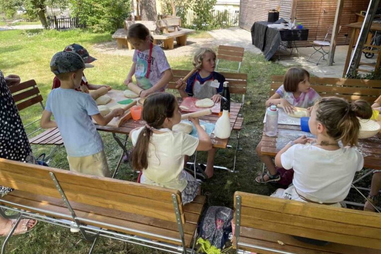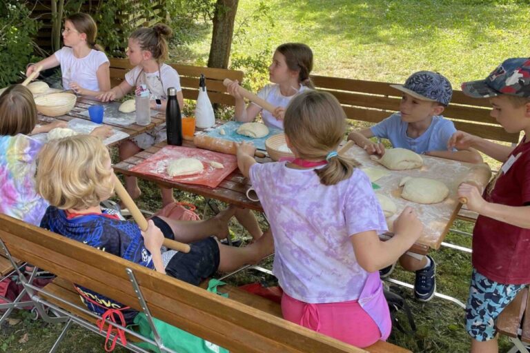 Am Mittwoch 31. Juli wurde im Rahmen des Sommerferienprogramms der Gemeinde Dußlingen an der Dußlinger Backstube gebacken. Die 10 Kinder teilnehmenden Kinder stellten mit Unterstützung von fünf Helferinnen und Helfern der Bürgerstiftung leckere Backwaren an einem schattigen Platz im Garten her.